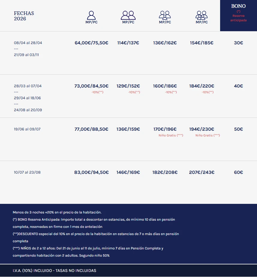 TODOS LOS PRECIOS INDICADOS SON POR DÍA, PARA ESTANCIAS DE 2 O MÁS NOCHES, Y EN RÉGIMEN DE MEDIA PENSIÓN (MP) O PENSIÓN COMPLETA (PC)